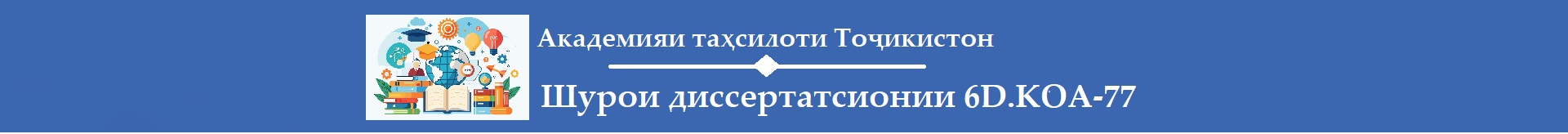 Шурои диссертатсионии 6D.КОА-077 ҷиҳати дарёфти дараҷаи илмии доктори фалсафа (PhD) – доктор аз рӯйи ихтисосҳои 6D010300 – Педагогика ва психология (6D010301 – Педагогикаи умумӣ, таърихи педагогика ва таҳсилот) ва 6D011800 – Забон ва адабиёти рус (6D011801.01 – Назария ва методикаи омӯзиш (таҳсилоти миёнаи умумй)) ва оид ба дарёфти дараҷаҳои илмии номзади илмҳои педагогӣ ва доктори илмҳои педагогӣ аз рӯйи ихтисоси 13.00.00 – Илмҳои педагогӣ (13.00.01 – Педагогикаи умумӣ, таърихи педагогика ва таҳсилот ва 13.00.02 – Назария ва методикаи таълиму тарбия (13.00.02.05 – Назария ва методикаи фанҳои ҷамъиятӣ (таҳсилоти миёнаи умумӣ)) дар назди Академияи таҳсилоти Тоҷикистон таъсис дода шудааст.